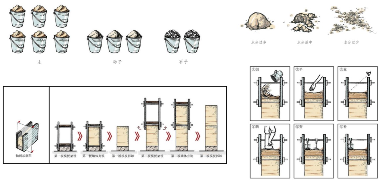 只有民居的套型在空間流線上與有小部分民居的套型類似,區別在于去掉了游客使用的空間和流線。以民宿為主的套型有五間固定裝配式客房、五間可移動裝配式客房,可滿足中等數量游客團體的居住需求。主人家可根據自己經濟實力的需求,選擇不同數量的可移動裝配式客房單體進行組合。在材料的選擇上,我們以西北地區特色的生土材料為主。夯土民居在施工難度與效率、材料的可得性、施工處理、保溫節能處理、造價等方面都有明顯的優勢(圖3)。在綠色建筑設計方面,我們設計了雨水收集循環再利用系統與太陽能光伏發電系統。