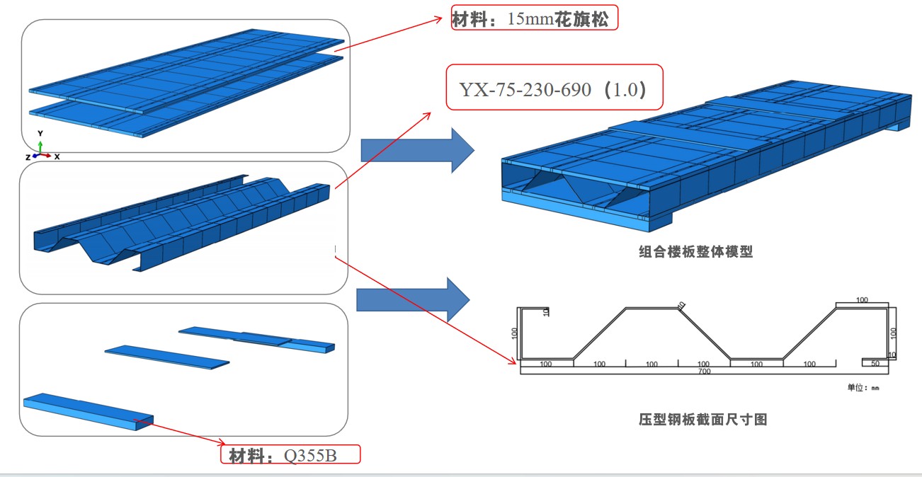 本次鋼框架結構和輕鋼龍骨架新合院樓板都采用 YX-75-230-690(1.0)的壓型鋼板組合板(圖5)針對鋼結構傳統民居以及休閑中心外墻,團隊采用新型夯土材料制成夯土墻體。選擇夯土材料的原因為:可就地取材,因地制宜;蓄熱節能性能突出,冬暖夏涼:材料加工過程低能耗、低污染。除此之外,夯土墻造價低廉,可大量減少經濟成本。對輕鋼結構民宿的墻體設計中,我們采用輕鋼龍骨架進行設計,并對墻體內設支撐和不設支撐通過有限元分析及對照試驗進行了分析對比,結果顯示:相較于無內支撐輕鋼龍骨框架而言,有內支撐輕鋼龍骨架在整體強度、剛度、耗能等方面的性能都有了顯著的提升。