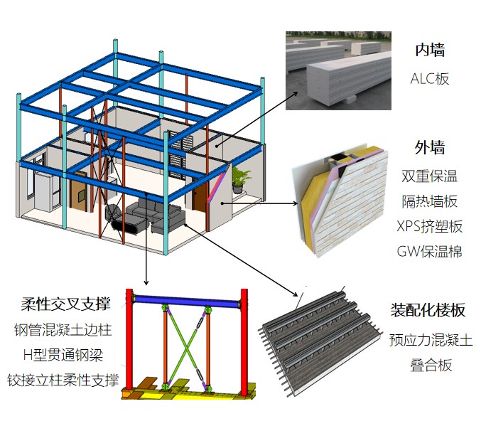 房屋結構采用鉸接支撐雙重抗側體系,由剛性貫通邊柱(鋼管混凝土柱)+貫通鋼梁+鉸接中柱+全裝配交叉支撐組成,節點全為螺栓連接,可實現現場施工全裝配。
