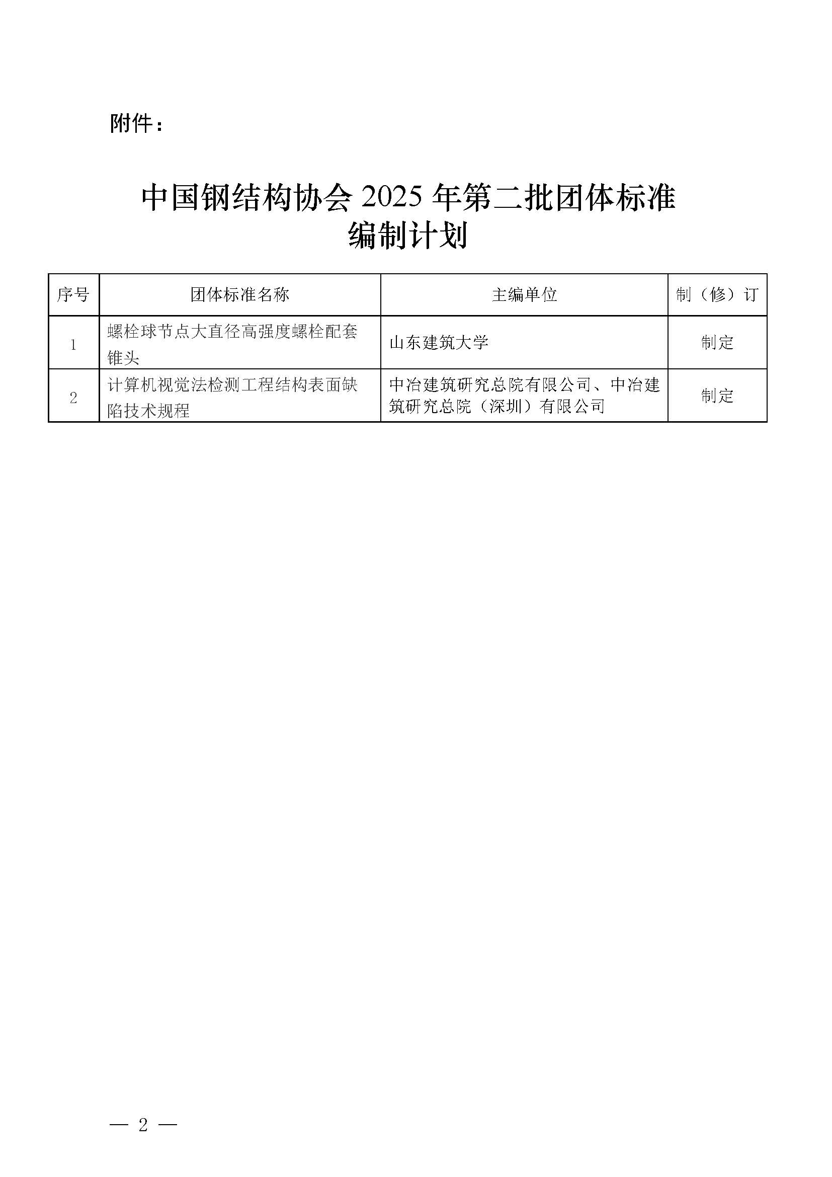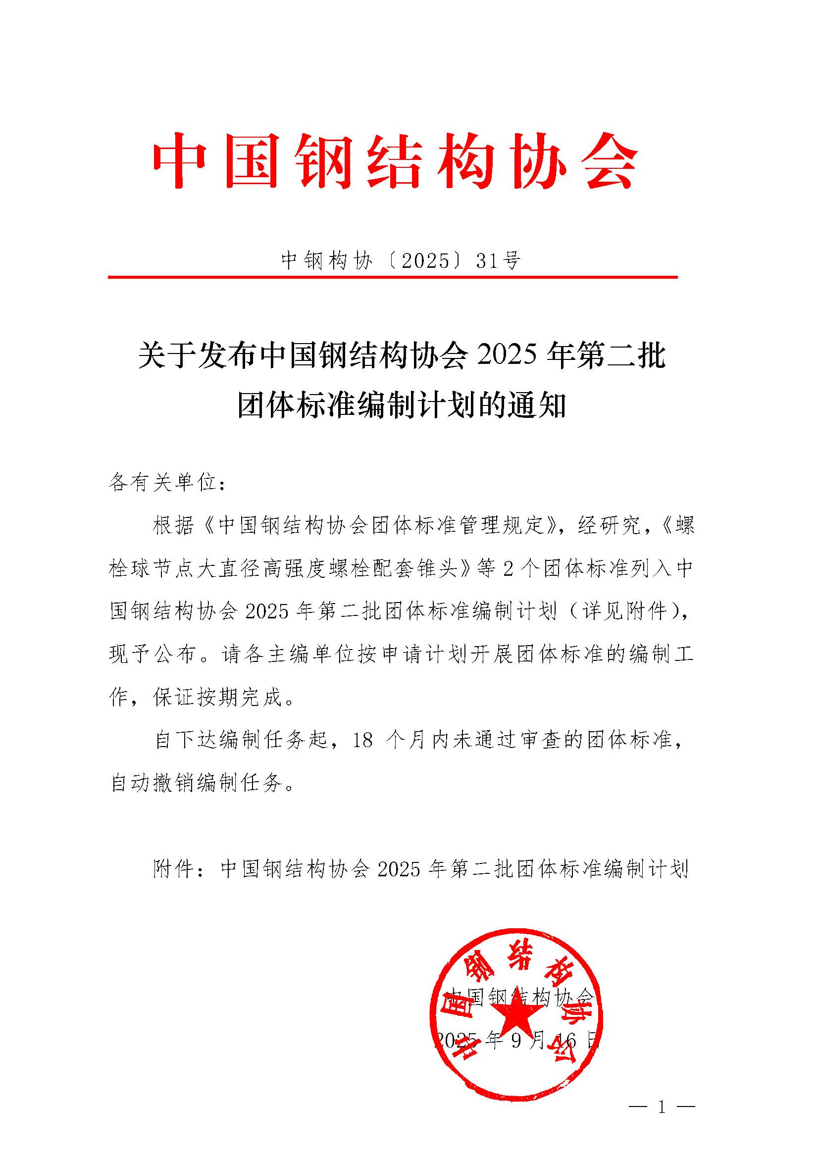 關于發布中國鋼結構協會2025年第二批團體標準編制計劃的通知